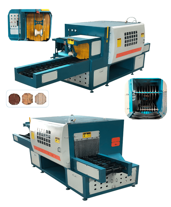 送 料:采用优质链条输送,机上配有的变频智能调速器,可以对大小木料的进料速度实行自由调速。原木可以实现自动分中,机上还配有限位开关,防止超去规格木料进入,防止卡木避免对机器造成损坏。